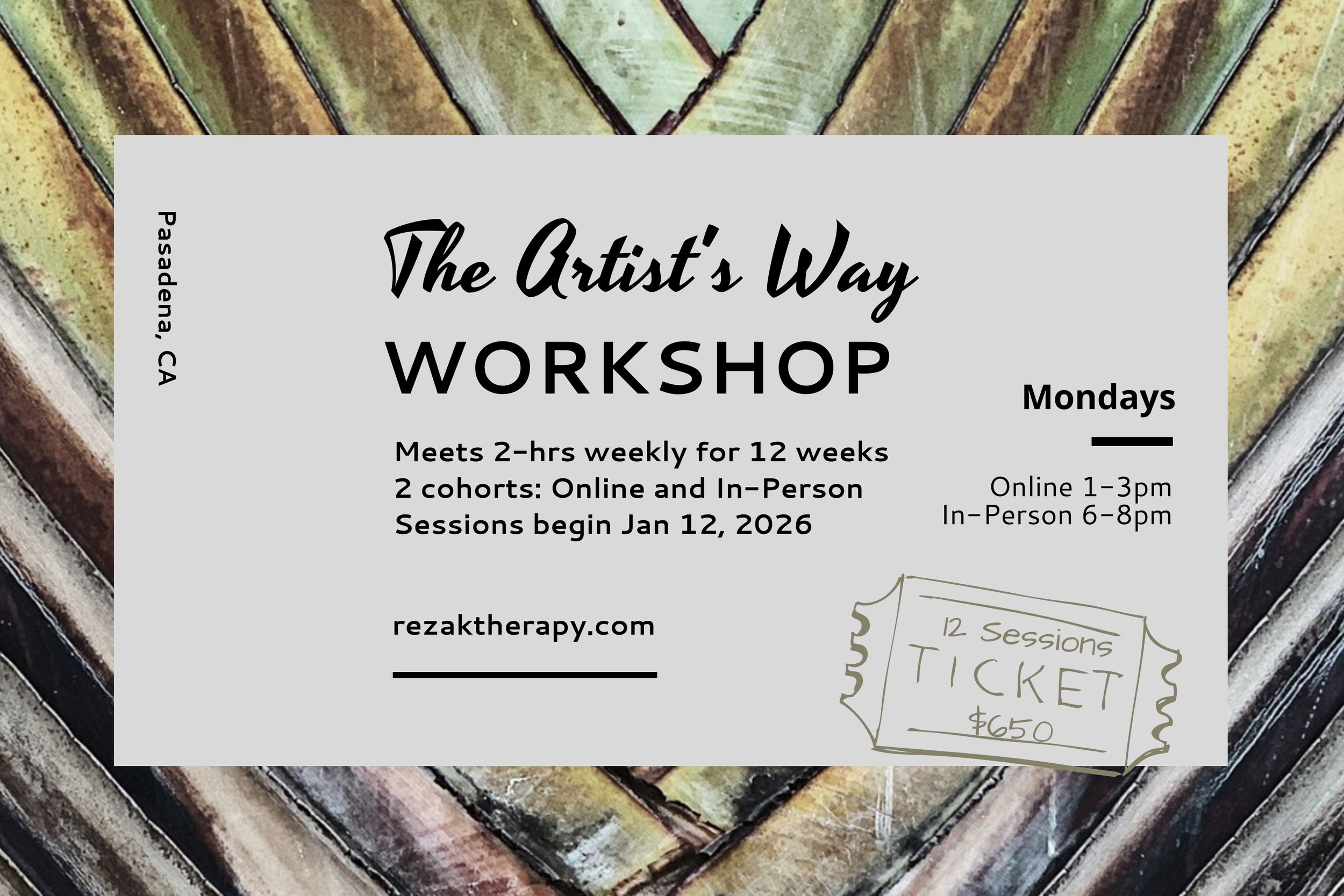 In-person in Pasadena, CA on Mondays from 6pm-8pm, Pacific time. Limited to 10 participants. 12-consecutive weeks starting January 12th, 2026.